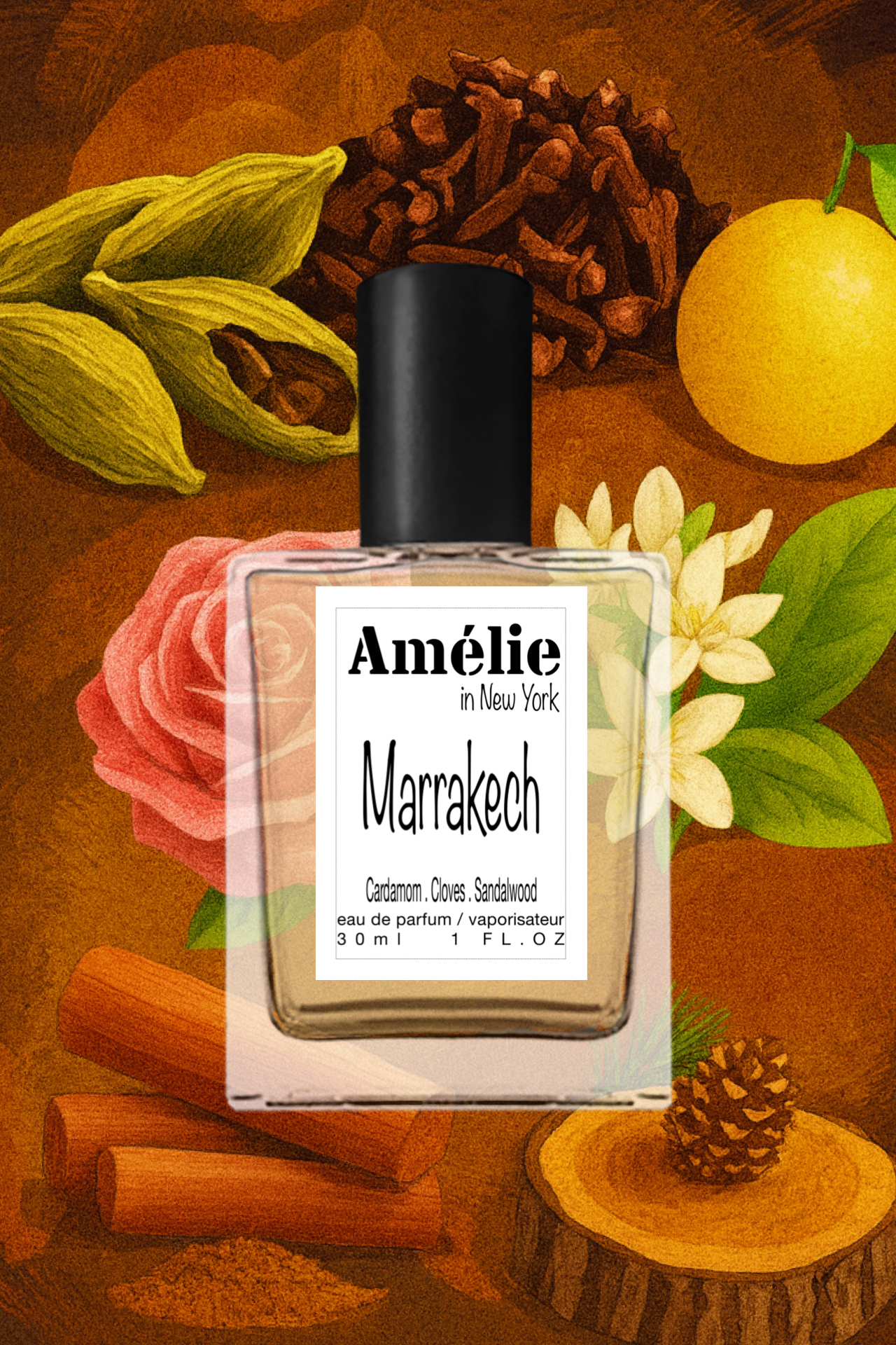 The opening is bright yet smoky — cardamom, alive with golden heat, dances with the piquant sting of clove, softened by the citrus shimmer of bergamot. It’s a vivid first impression, like stepping into a Moroccan spice market, where each breath is a new discovery. Then, slowly, the heart opens — rose, neroli, and jasmine bloom together like silk scarves unfurling in the wind. Their sweetness doesn’t shout; it smolders, mingling with dust and sun, with laughter and quiet seduction.